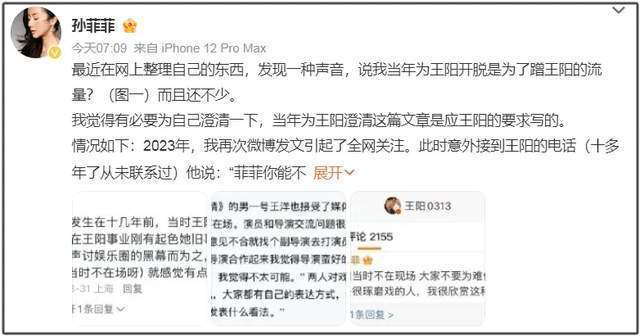 孙菲菲表示2023年发布殴打经历获全网关注,十多年没联系的王阳主动联系她寻求帮助,表示自己因为孙菲菲被骂,孙菲菲则答应替他说话,而那些内容也都是按照王阳方面要求写的。