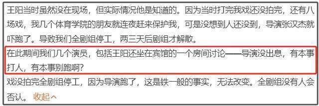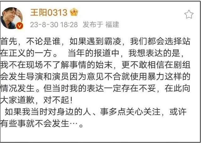 剧组霸凌不是小事,不会只有一个受害人,若王阳不想卷入与导演及剧组的霸凌风波,那么他只要当场表示不在现场就好,但却公然混淆事实,站在打人方帮忙开脱,明显是对受害者的污蔑。
