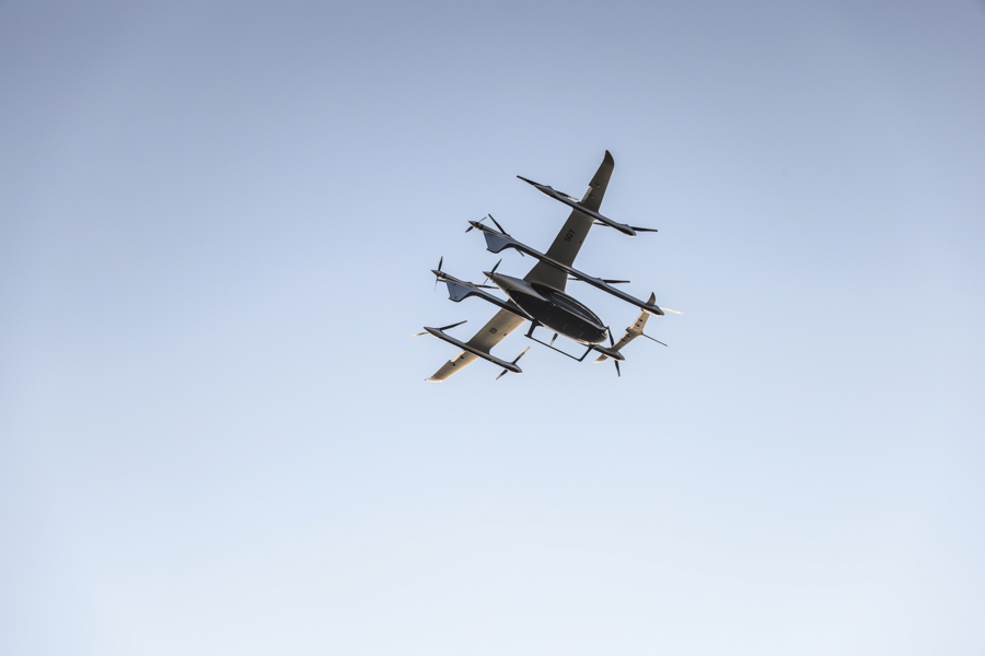 图为峰飞航空在昆山淀山湖水面上空进行多架机编队实景演示,三架2吨级eVTOL编队飞行。