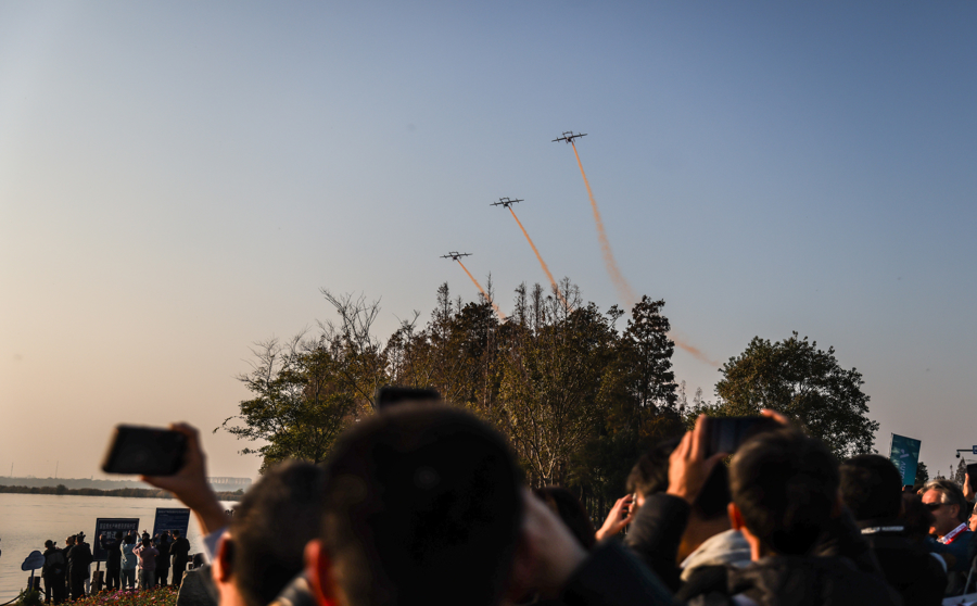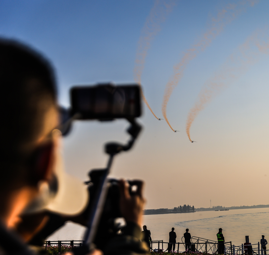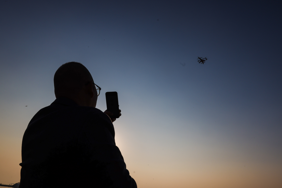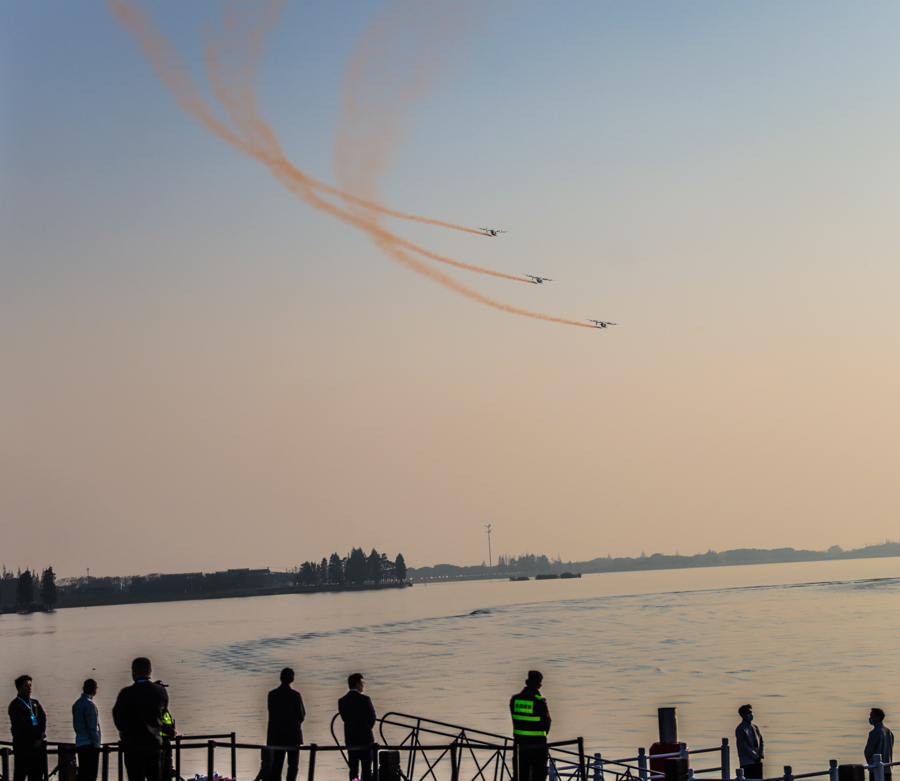 图为三架2吨级eVTOL编队飞行,拉出三条橙黄色的尾烟,在水天之间划出绚丽的弧线。